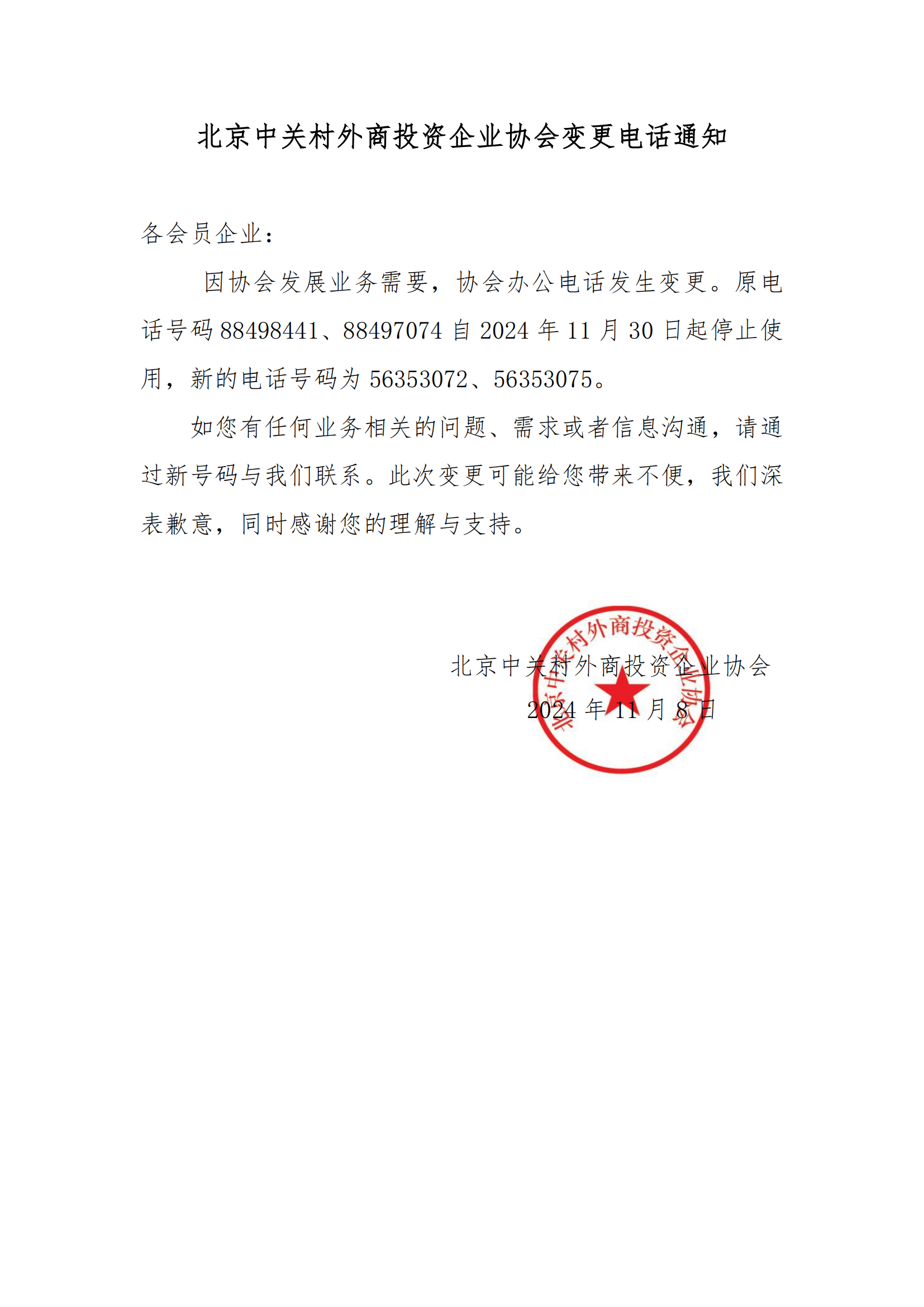 北京中关村外商投资企业协会变更电话通知
