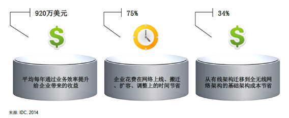 2 降低搬迁成本,加快新办公室上线速度:新办公室网络部署时间缩短约80%,网络CAPEX下降70%。联想每年的IT支出中有30%用于硬件基础设施,在使用无线解决方案的情况下,一个AP可连接用户的数量是交换机的15 倍,可在接入层节省70%的费用支出,还包括布线、网络硬件购买和后期运维等方面的支出。