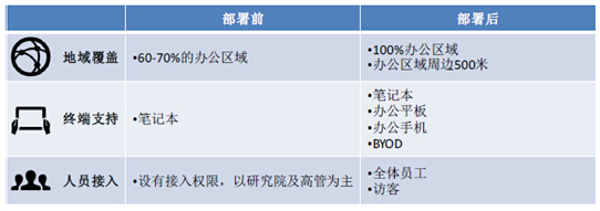 结合全无线网络环境的上线,顺应员工办公习惯的变化,联想为员工配备了工作手机和平板电脑,同时支持员工BYOD及外来访客的无线接入。与之前相比,Wi-Fi接入率极大提高,无线客户端在工作时间的实时在线用户超过2万。截至2014年6月,新的无线办公网已覆盖北京地区的所有办公区域(北研、大厦、望京、开拓),用户峰值达到近12,000,并以每月10-20%的速度增长。