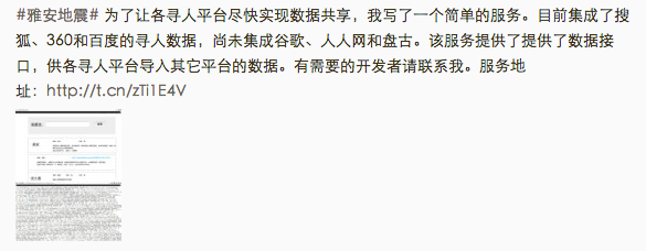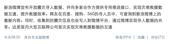 今早 @微博开放平台表示,已经向多家合作方提供专用推送接口,实现灾难救援数据互通,提升救援效率。目前 360、搜狗、百度可以将寻人信息写入到微博平台,彼此之间实现互通。同时也支持将寻人信息发布到微博。