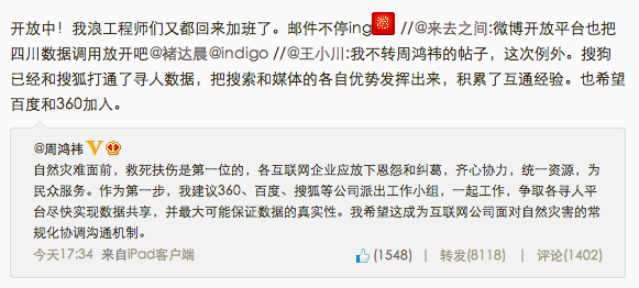 “自然灾难面前,救死扶伤是第一位的,各互联网企业应放下恩怨和纠葛,齐心协力,统一资源,为民众服务。作为第一步,我建议 360、百度、搜狐等公司派出工作小组,一起工作,争取各寻人平台尽快实现数据共享,并最大可能保证数据的真实性。我希望这成为互联网公司面对自然灾害的常规化协调沟通机制。”