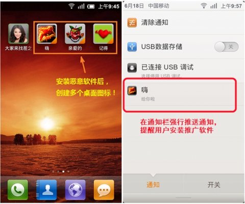 “幽灵推手”下载安装之后,还会在桌面创建多个图标,当用户点击这些图标时,就会进入推广软件的安装界面。即便用户手动删除这些桌面图标,用不了多久这些图标就会卷土重来,再次出现在用户手机桌面。为了达到推广的目的,该软件还会定期弹出推广软件的安装界面,严重影响用户的使用体验。此外,该病毒不仅会严重影响用户桌面的正常使用,还会在通知栏恶意提醒并诱导用户安装推广软件,用户一旦误点将自动完成安装。