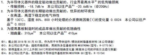 伴随基站和各种终端高功能化的半导体元器件的大型化和安装数量的增加等方面的因素,组件基板和模块基板呈现大型化的趋势。因此,基板材料翘曲引起的制造时的成品率恶化曾是面临的课题。本产品虽然采用的是低介质衰耗因数、低介质常数的材料,但同时兼顾低CTE,有效抑制了翘曲量,从而为提高基板制造时的成品率做出贡献。