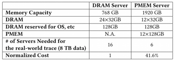 英特尔® 傲腾™ 持久内存的加持满足特征工程数据库对大内存的需求。下图显示了在论文实验中使用的机器配置,在 10TB 数据的业务场景中,基于持久内存的 FEDB 的硬件成本仅为基于纯内存版本的 41.6%。