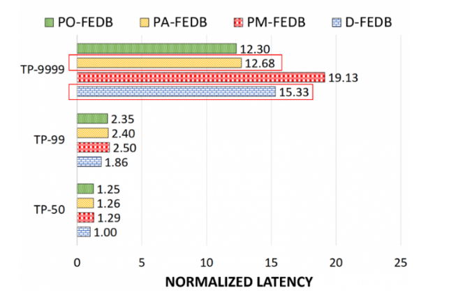 基于英特尔® 傲腾™ 持久内存进行持久化数据结构设计的 FEDB 舍弃了原有纯内存方案以及基于外存储设备的备份机制,实现了长尾延迟(TP-9999)接近 20% 的改善(见下图,PA-FEDB 为基于持久内存优化的 FEDB,D-FEDB 为内存版本的 FEDB )。