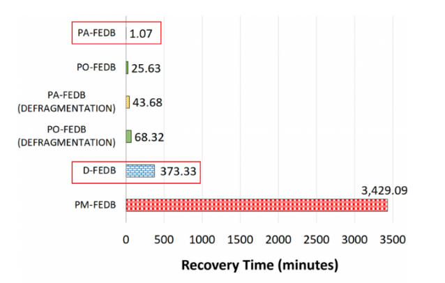 在服务中断情况下实现数据快速恢复,服务恢复时间减少 99.7%,全面降低对线上服务质量的影响。如在论文中描述的结果(见下图,PA-FEDB 为基于持久内存优化的 FEDB,D-FEDB 为内存版本的 FEDB),在实际业务场景中,其数据恢复时间从原来的六个小时缩短至一分钟左右。