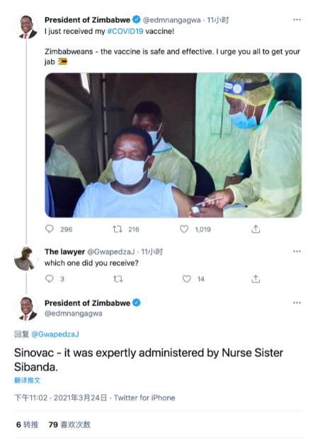 接种疫苗前,姆南加古瓦发表讲话,对中国等国家向津援助或出口新冠疫苗表示感谢,并表示相关国家的支持对津巴布韦获得疫苗资源、实现群体免疫至关重要。