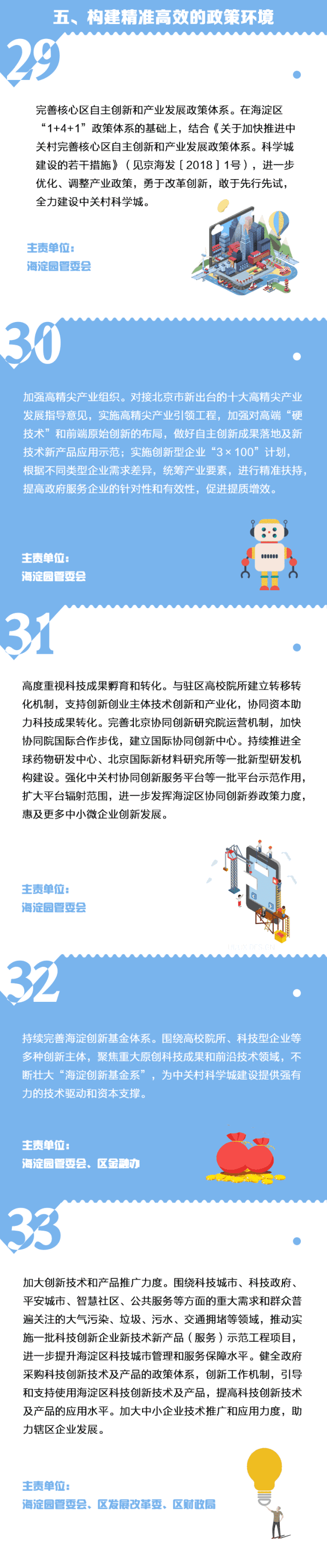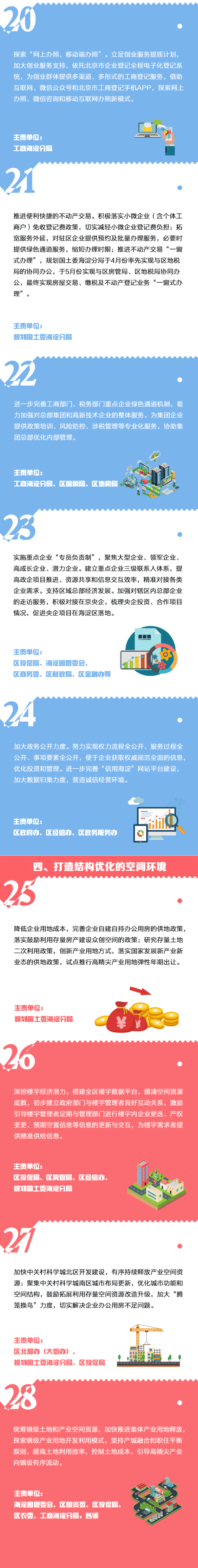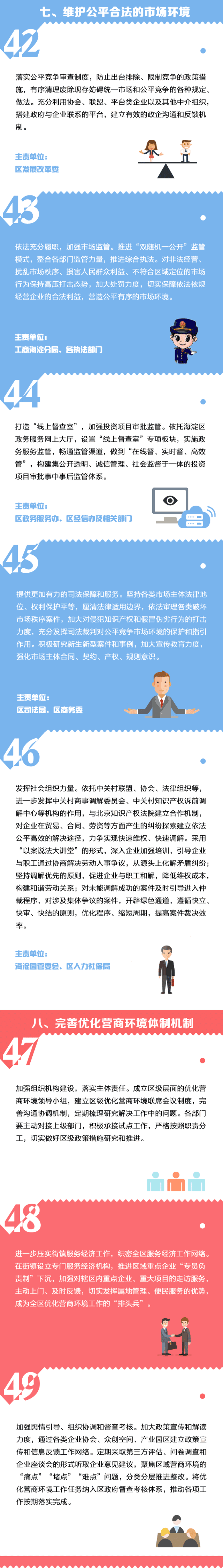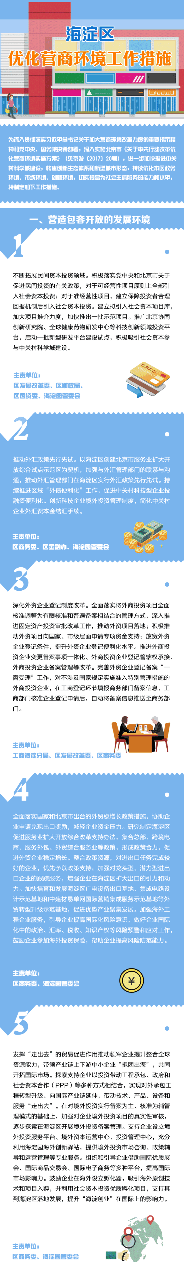 海淀区日前出台《海淀区优化营商环境工作措施》,包含营造包容开放的发展环境、完善透明高效的投资环境、营造快捷便利的政务环境、打造结构优化的空间环境、构建精准高效的政策环境、优化宜业宜居的人才环境、维护公平合法的市场环境、完善优化营商环境体制机制等八个方面的49项具体措施,旨在进一步加快推进中关村科学城建设,构建创新生态体系和新型城市形态,持续优化本区政务环境、市场环境、创新环境,切实提高为社会主体服务的能力和水平。