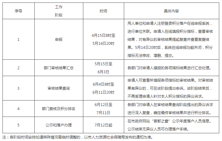 本市积分落户工作实行年度申报制。2021年申报工作分为申报、部门审核结果汇总、审核结果查询、部门复核及积分排名、公示和落户办理5个阶段。各阶段安排如下: