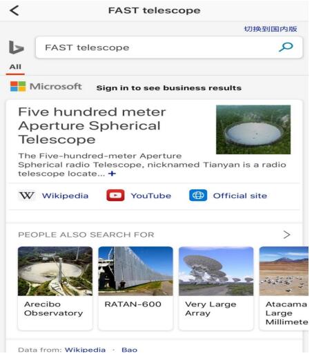此外,用户还可以直接点击 App 中最上方的搜索框,选择用 Bing 进一步搜索更多相关新闻,或者查询不熟悉的词汇和概念,而不必换用浏览器搜索。结合 Bing 在英文搜索领域的领先优势与人工智能技术,Bing 正在为人民日报英文客户端的用户提供更加准确、全面、智能的英文搜索体验。自上线以来,Bing 国际版每天都会在全球范围内扫描抓取 260 亿个新网页并更新到搜索数据库中,保证用户能够得到与其搜索内容相关的最新资讯,此外,Bing 搜索国际版还囊括了广泛覆盖全球各地、不同领域、不同学科的超过 20 亿条知识图谱信息。在搜索体验上,Bing 国际版能够真正理解英文语义,而不只是简单地把英文单词放在搜索栏中,寻找简单的文本匹配;基于 Bing 国际版的支持,Bing 国内版可以实现跨语种的搜索体验,为用户带来更有效的搜索结果。